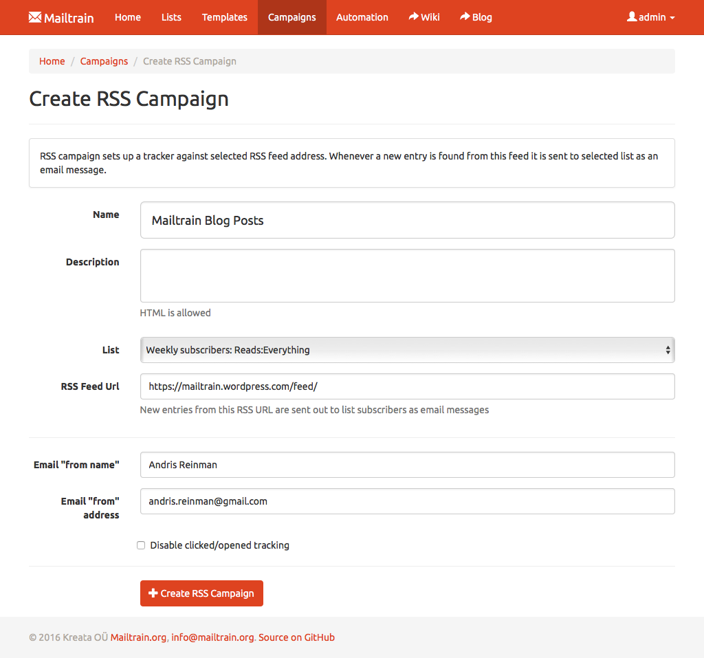 Setup Mailtrain to track RSS feeds and if a new entry is detected in a feed then Mailtrain auto-generates a new campaign using entry data as message contents and sends it to selected subscribers.